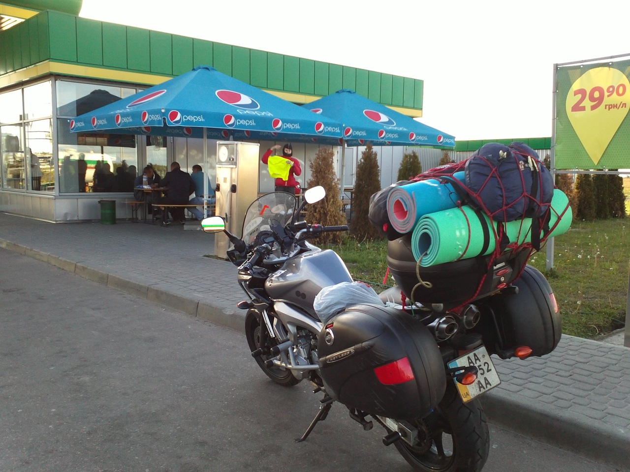 Первая наша остановка в Виннице, последний час мы едем уже по темному, вся встречка мне яростно моргает. Нагруженный задок задрал фару в небо. Приехав в Винницу, я опустил фару (хотя в течении следующих месяцев мы почти не ездили ночью). Также возник вопрос с задним амортизатором, его следовало подкрутить на самые жесткие настройки. В Виннице я заехал на мотосто, где мне помогли с амортом.