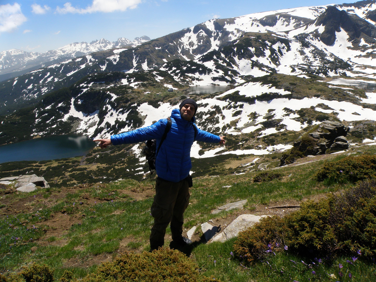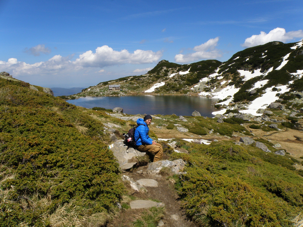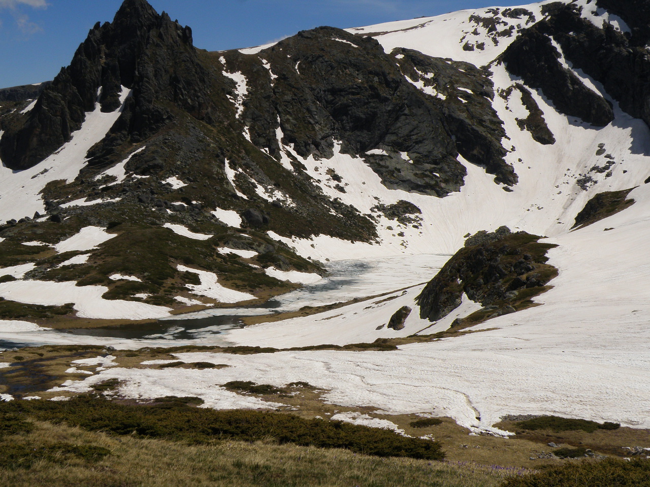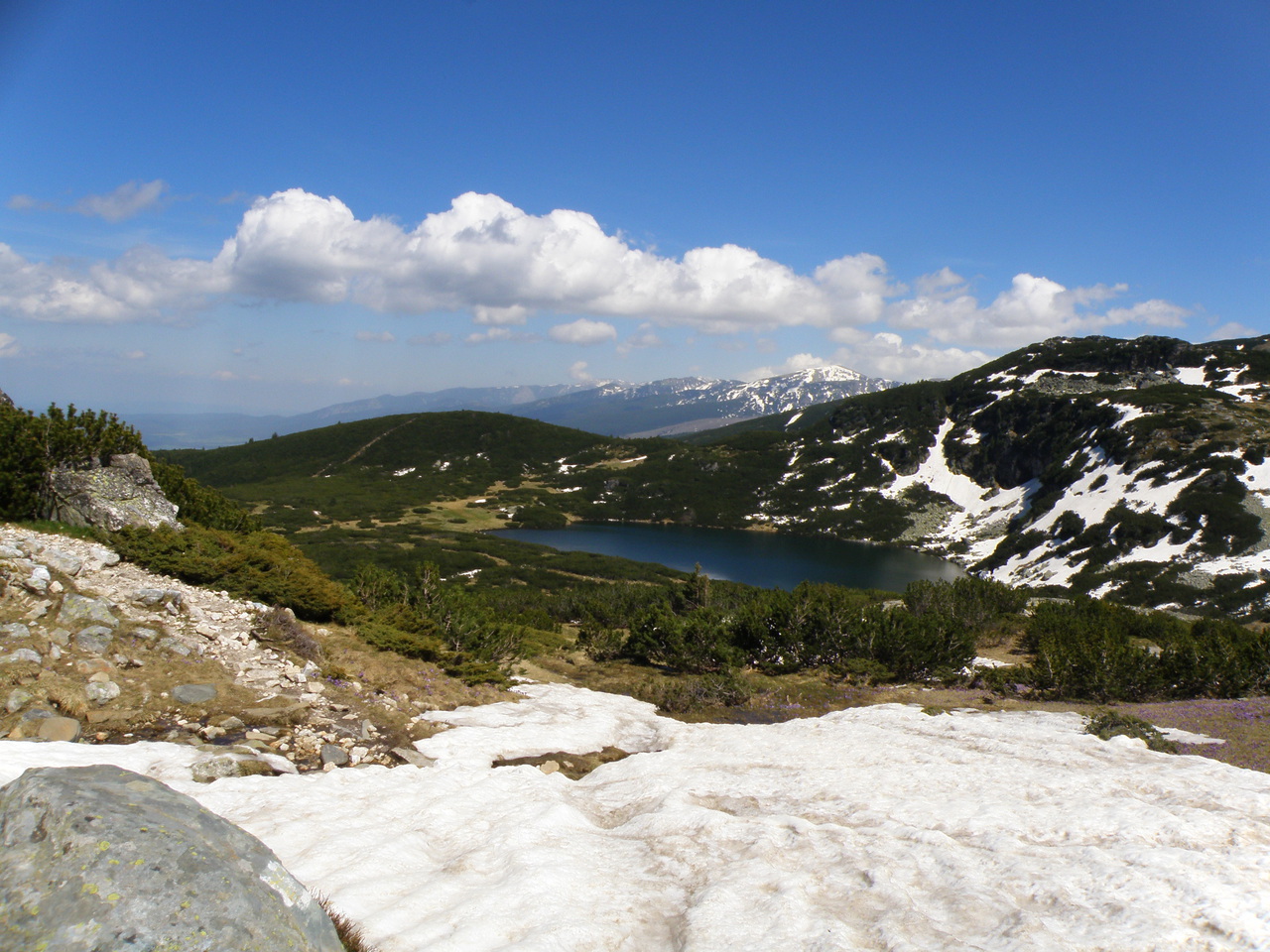 Над всей этой пустошью возвышаются великолепные пики Пирина. Мы решили поиграть в походников и пошли в горы. И так загуляли, что дошли до снега и поднялись до высоты 1900м, стартовав с 1000м. Наверху только начали распускаться некоторые деревья, вокруг были классические горные пейзажи.