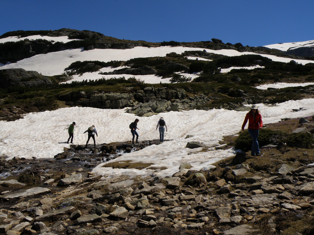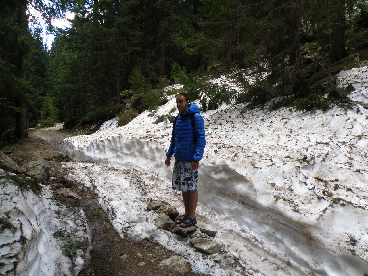 Мы поднялись по канатке и дальше пошли пешком, первое озеро начинается на 2300 и на тот день (31 мая) оно уже полностью размерзлось. Тропинка уводила вдаль от озер, кружным путем мы пришли прямо к пятому озеру, которое было полностью во льду, кроме одного уголка. Выше пятого озера лежал сплошной снег и только некоторые смельчаки карабкались вверх по снегу к 6 и 7 озеру. Наши альпинстарсы явно не были предназначены для ходьбы по снегу и быстро промокали. От пятого озера мы начали спускаться вдоль основной гряды озер. Каждое следующее озеро всё больше освобождалось от льда. Хотя пройти по сухому в некоторые моменты становилось все труднее и труднее.