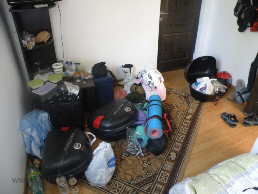 Мне приходилось резко тормозить посреди Телиги, потому что шмотки почти болтались по асфальту. Так дальше нельзя, мы снимаем дождевики с заднего кофрам и прикручиваем их к пассажирским ручкам. Прятать дождевики в кофры не имеет смысла, потому что доставать их из кофров во время дождя - процедура неприятная. Да и места в кофрах просто нет.