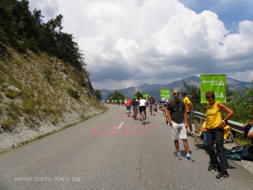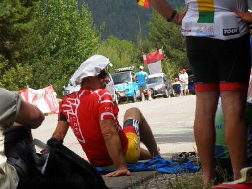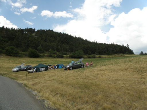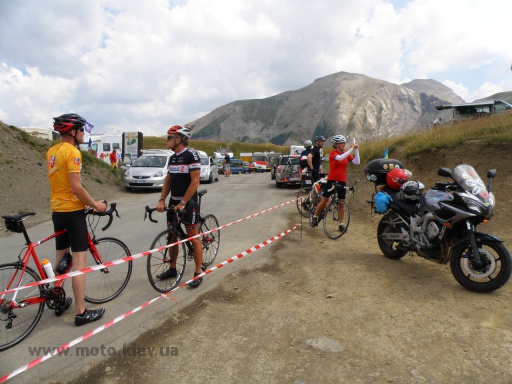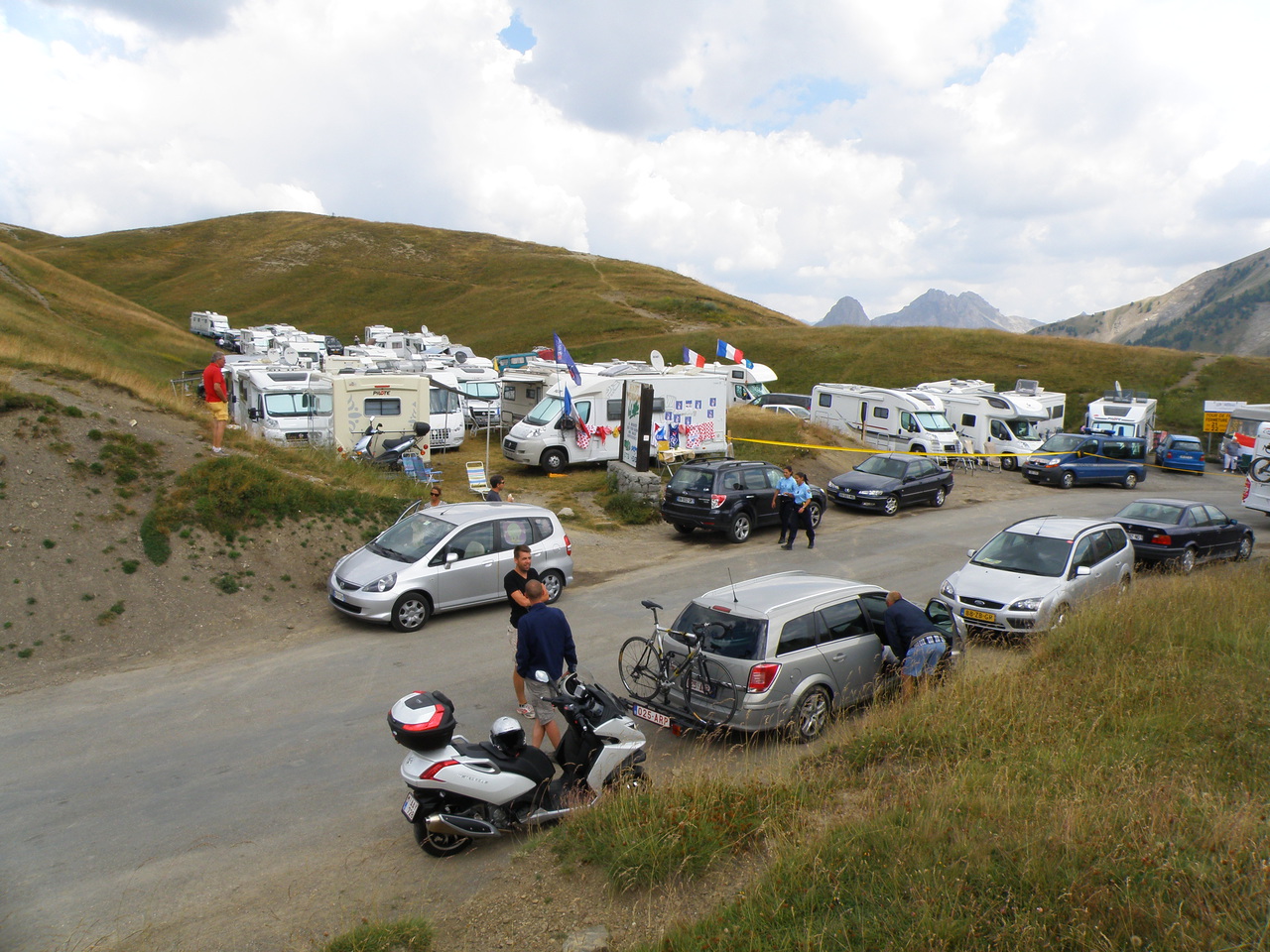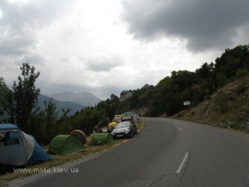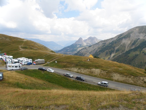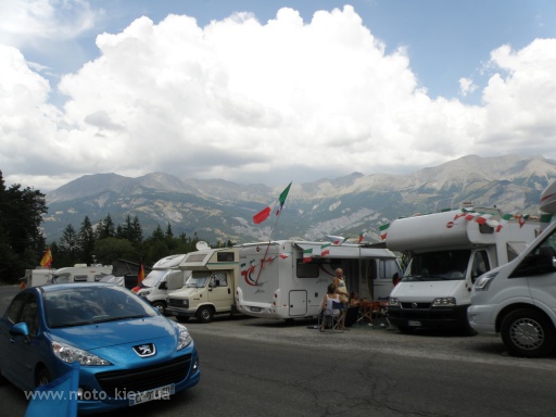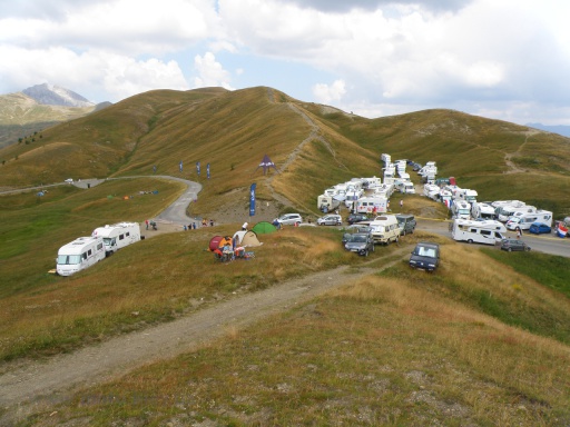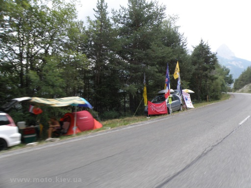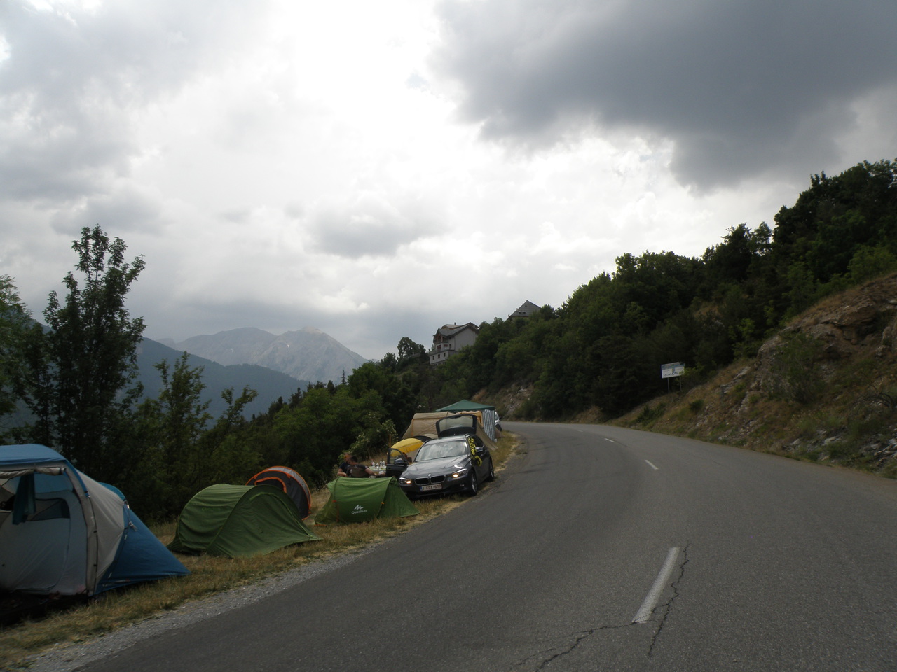 Первоначально мы хотели залечь именно на Коль д'Аллос, но, изучив интернет и информационные таблички вдоль дороги, узнали, что спуск закрывается уже сегодня вечером и утром туда не проедешь со стороны Барселоннета. Пока я думал над это проблемой, мы доехали до вершины перевала. На вершине было весьма прохладно и весьма людно. Кемперы оккупировали единственную ровную площадку на вершине, тут и там попадались палатки на склоне гор. Думаю, ночью там было совсем не жарко в палатках! Я смотрел вокруг и поражался таким верным болельщикам, их неприхотливости и терпению.