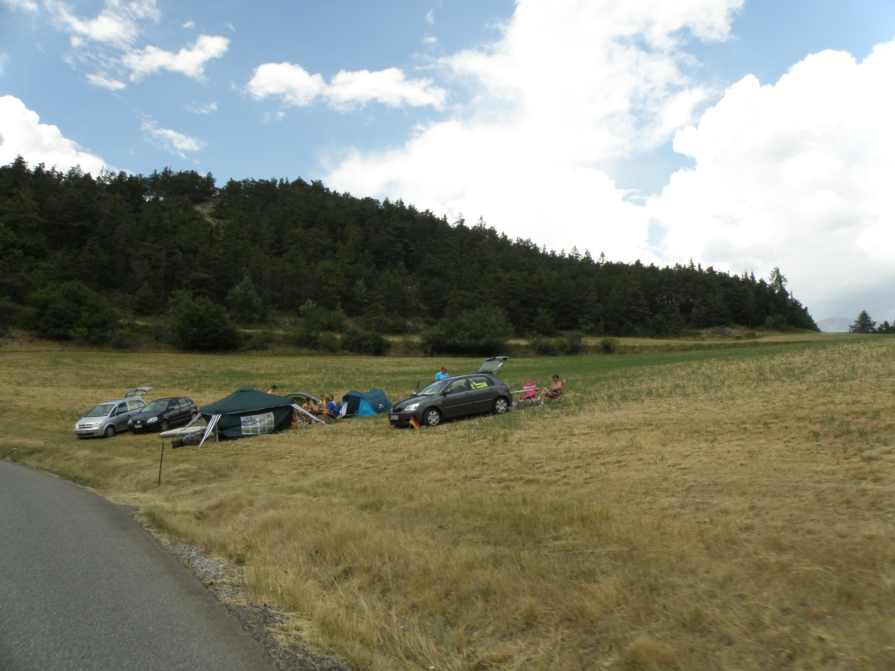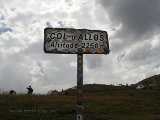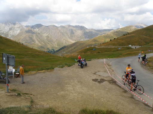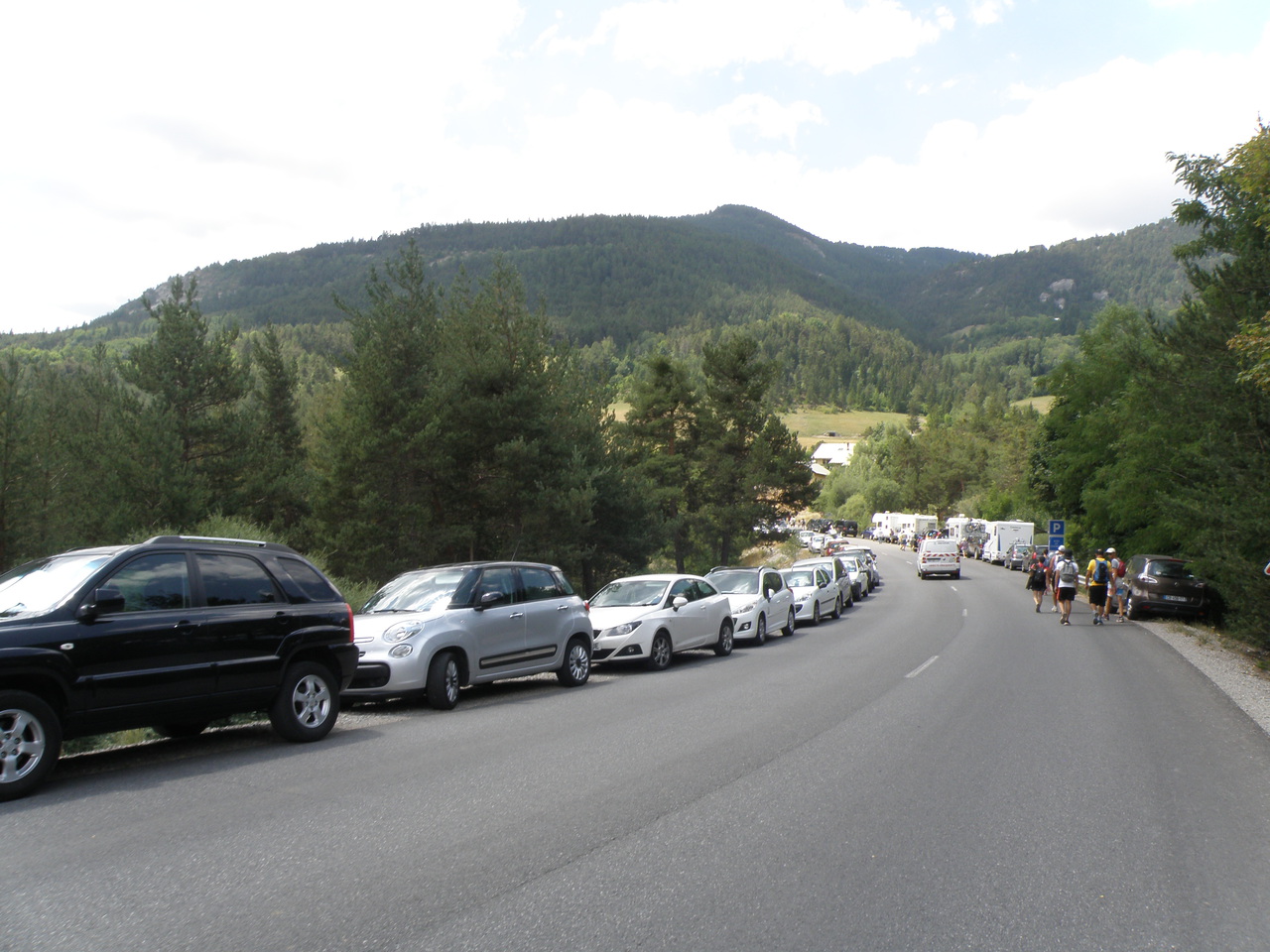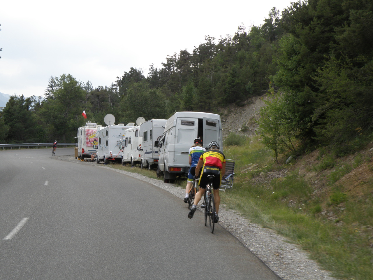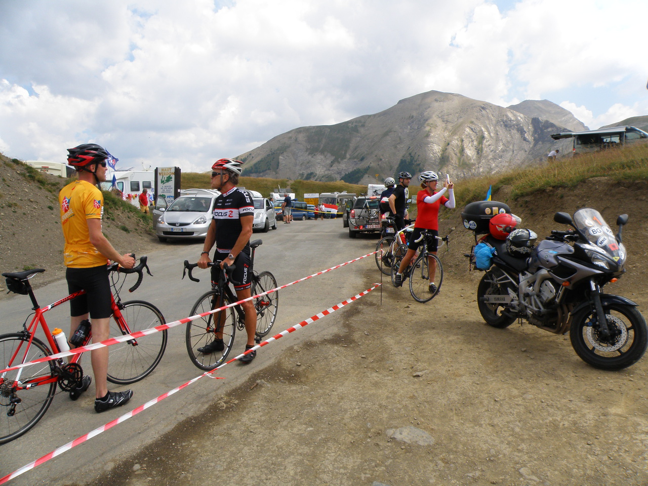 Первоначально мы хотели залечь именно на Коль д'Аллос, но, изучив интернет и информационные таблички вдоль дороги, узнали, что спуск закрывается уже сегодня вечером и утром туда не проедешь со стороны Барселоннета. Пока я думал над это проблемой, мы доехали до вершины перевала. На вершине было весьма прохладно и весьма людно. Кемперы оккупировали единственную ровную площадку на вершине, тут и там попадались палатки на склоне гор. Думаю, ночью там было совсем не жарко в палатках! Я смотрел вокруг и поражался таким верным болельщикам, их неприхотливости и терпению.