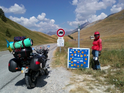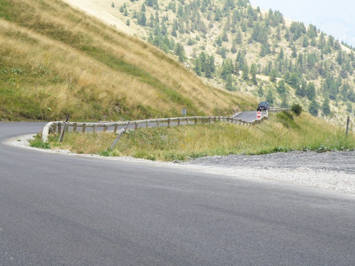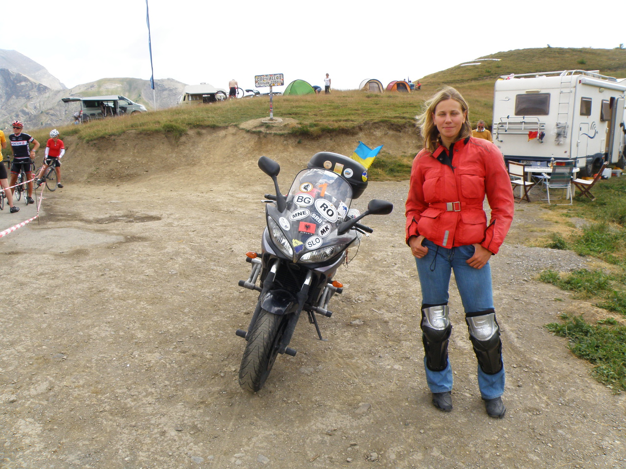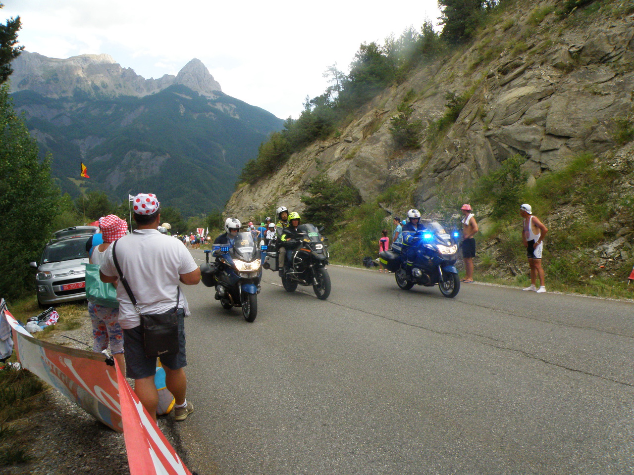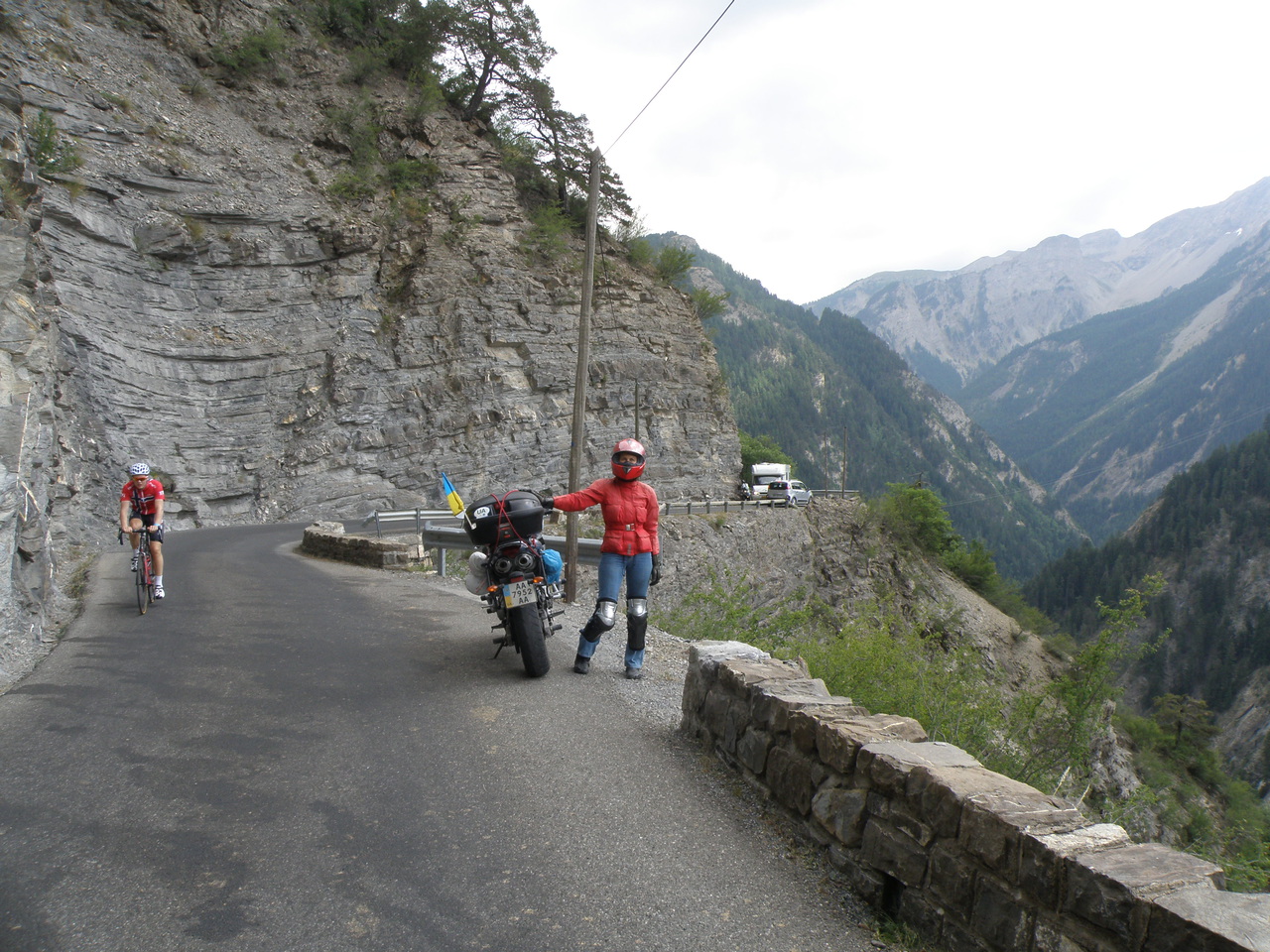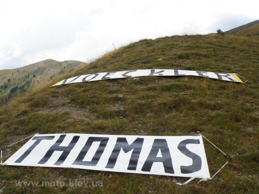 Первоначально мы хотели залечь именно на Коль д'Аллос, но, изучив интернет и информационные таблички вдоль дороги, узнали, что спуск закрывается уже сегодня вечером и утром туда не проедешь со стороны Барселоннета. Пока я думал над это проблемой, мы доехали до вершины перевала. На вершине было весьма прохладно и весьма людно. Кемперы оккупировали единственную ровную площадку на вершине, тут и там попадались палатки на склоне гор. Думаю, ночью там было совсем не жарко в палатках! Я смотрел вокруг и поражался таким верным болельщикам, их неприхотливости и терпению.