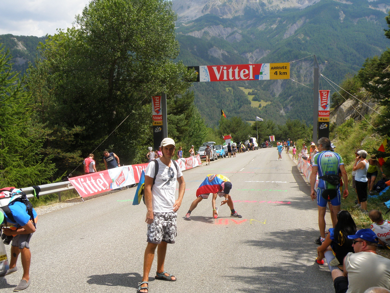Идти пешком в гору было не так-то и легко под палящим солнцем, мы дошли до отметки 4 км до финиша, нашли кусочек тени вдоль дороги и залегли там, наблюдая за народом вокруг. Колумбийские болельщики разрисовывали асфальт, напротив скучал одноногий велосипедист, группа школоты подбадривала всех мимо проезжающих велосипедистов.