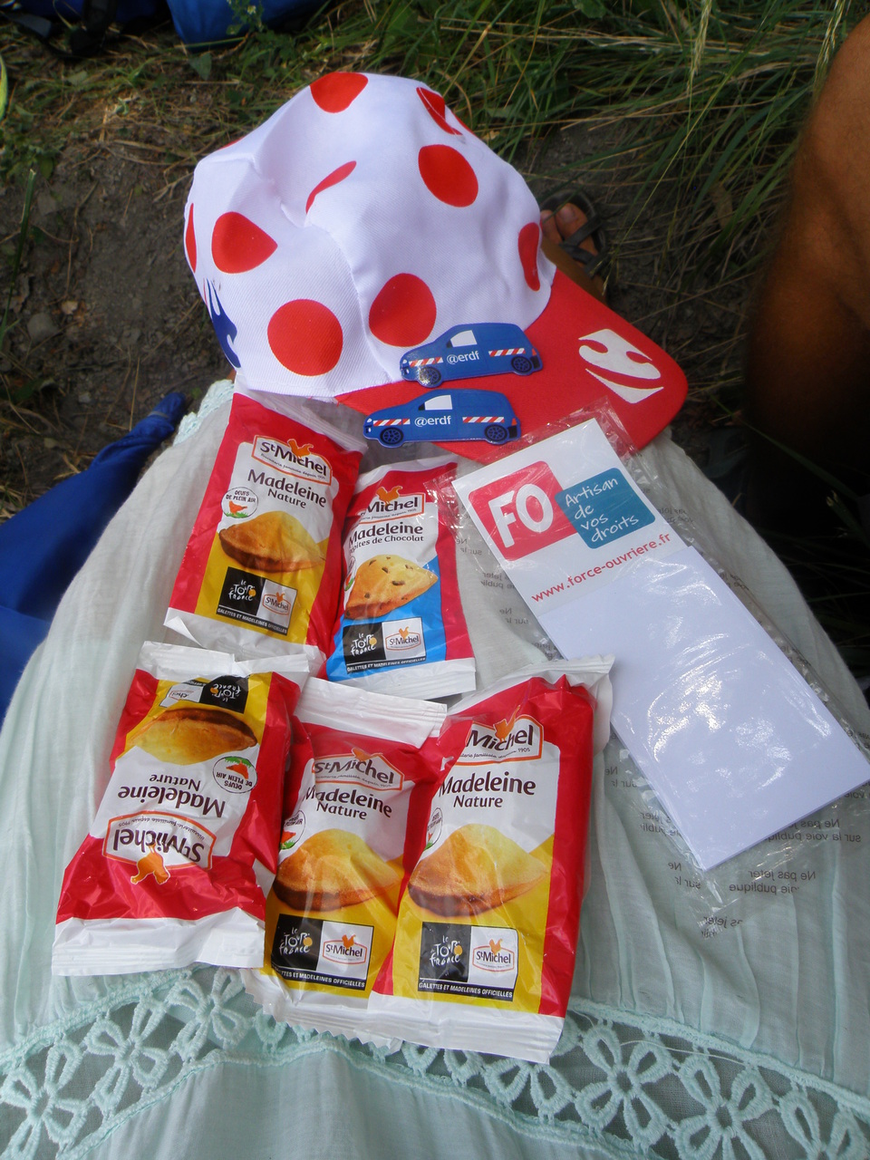 Рекламный караван появился внезапно и представлял собой самые замысловатые машины, какие только можно представить. В кузове каждой машины сидели девочки и раскидывали всякую мелочь зрителям. Я сначала не понял, что происходит, пока в меня не попали пачкой бисквитов. Люди вокруг повскакивали со своих мест и начали очень ловко ловить разнообразные предметы: кепки, сумки, печеньки, магниты и много другого. Нам только оставалось удивляться опытности и сноровке болельщиков вокруг, видно было, что им не привыкать ловить всю эту мелочь.