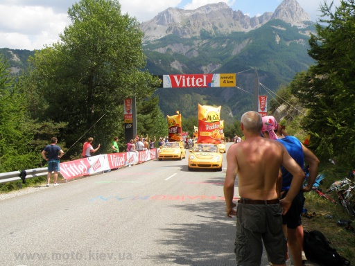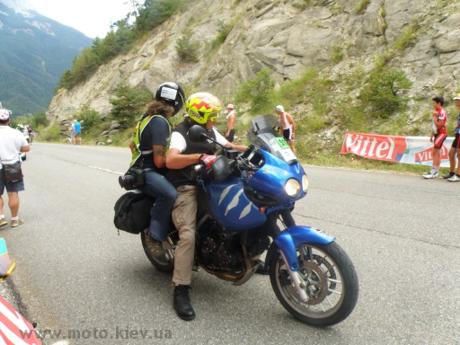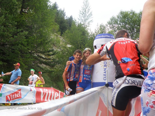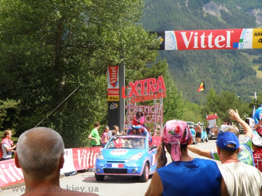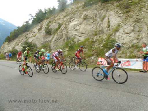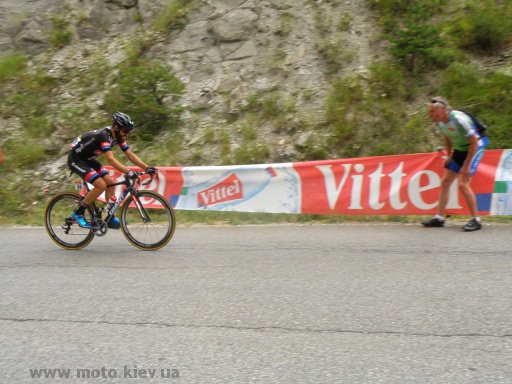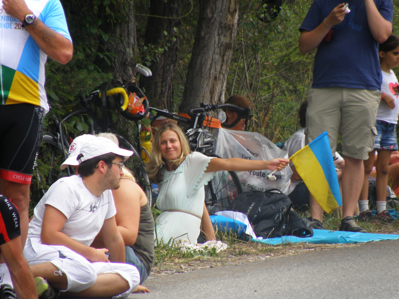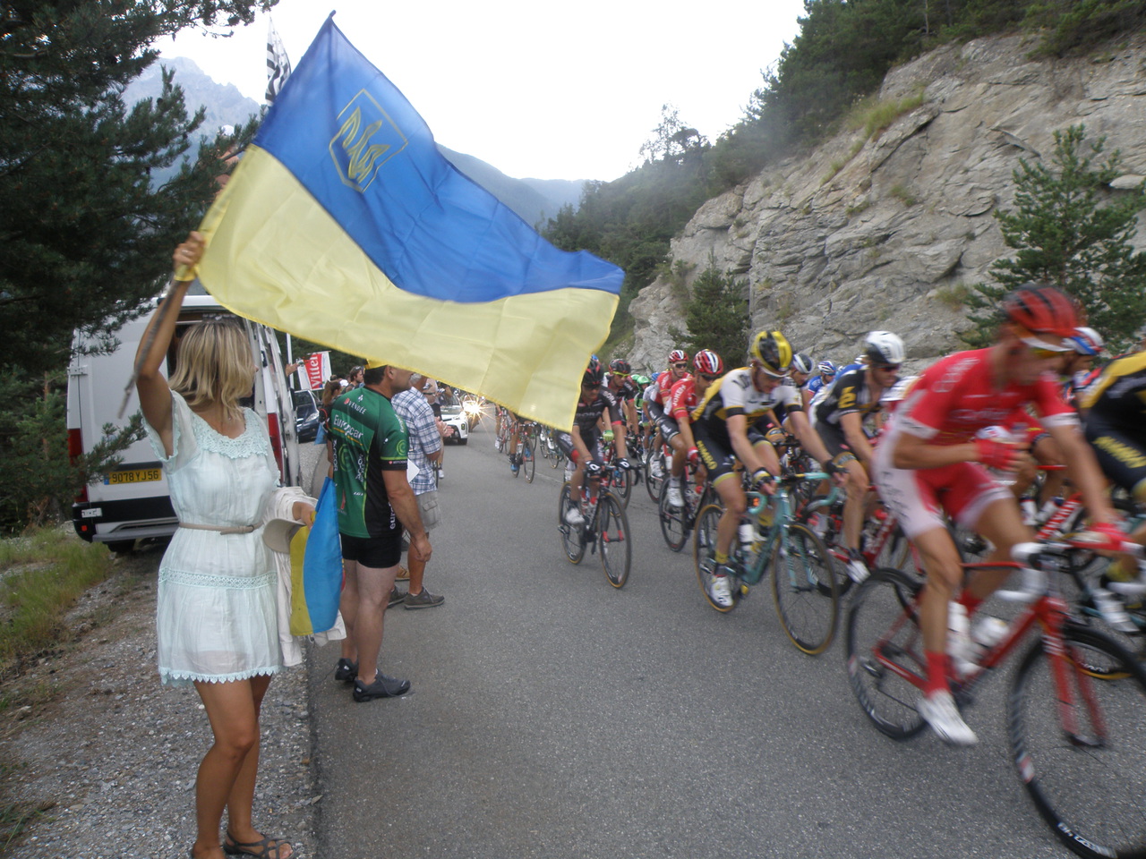 Неожиданно из-за угла появился желтый мотоцикл, с желтой нажопницей, которая держала табличку со временем отрыва от пелотона. За ней ехал лидер гонки в окружении 100500 мотоциклов. Зрители все как один завопили "Алле, Алле! (фр. Allez - фпирёд!)" и начали махать руками, флагами, кепками и всякими другими предметами. Мы сразу просекли фишку и тоже орали "Allez!" и размахивали флагом, попутно высматривая единственного украинского гонщика - Андрея Гривка, который выступал за команду Астана. Потом были еще несколько одиноких гонщиков и уже после них была небольшая группа лидеров. Но даже в гору они шли довольно быстро, потому времени рассмотреть легенд мирового велоспорта было всего пару секунд. После них шел первый пелотон, в котором мы таки увидели Гривка, он нас тоже заприметил и даже умудрился нам помахать в ответ. Лера была на седьмом небе от счастья.