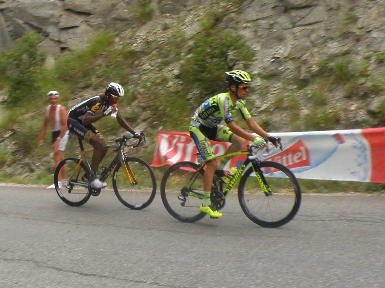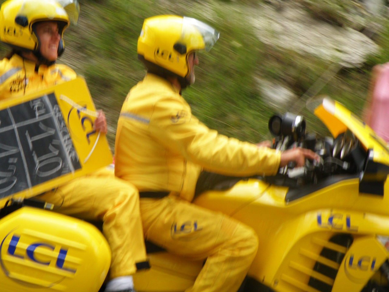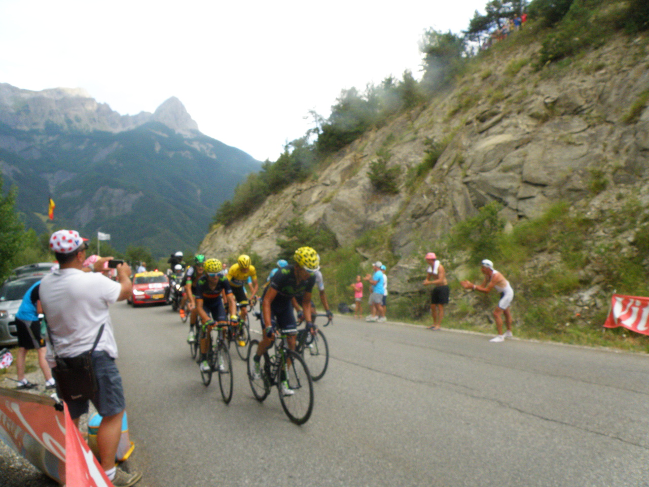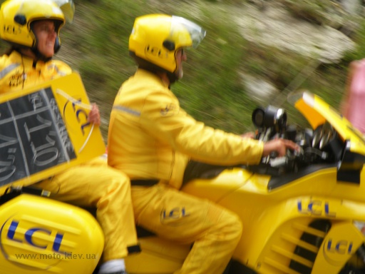 Неожиданно из-за угла появился желтый мотоцикл, с желтой нажопницей, которая держала табличку со временем отрыва от пелотона. За ней ехал лидер гонки в окружении 100500 мотоциклов. Зрители все как один завопили "Алле, Алле! (фр. Allez - фпирёд!)" и начали махать руками, флагами, кепками и всякими другими предметами. Мы сразу просекли фишку и тоже орали "Allez!" и размахивали флагом, попутно высматривая единственного украинского гонщика - Андрея Гривка, который выступал за команду Астана. Потом были еще несколько одиноких гонщиков и уже после них была небольшая группа лидеров. Но даже в гору они шли довольно быстро, потому времени рассмотреть легенд мирового велоспорта было всего пару секунд. После них шел первый пелотон, в котором мы таки увидели Гривка, он нас тоже заприметил и даже умудрился нам помахать в ответ. Лера была на седьмом небе от счастья.