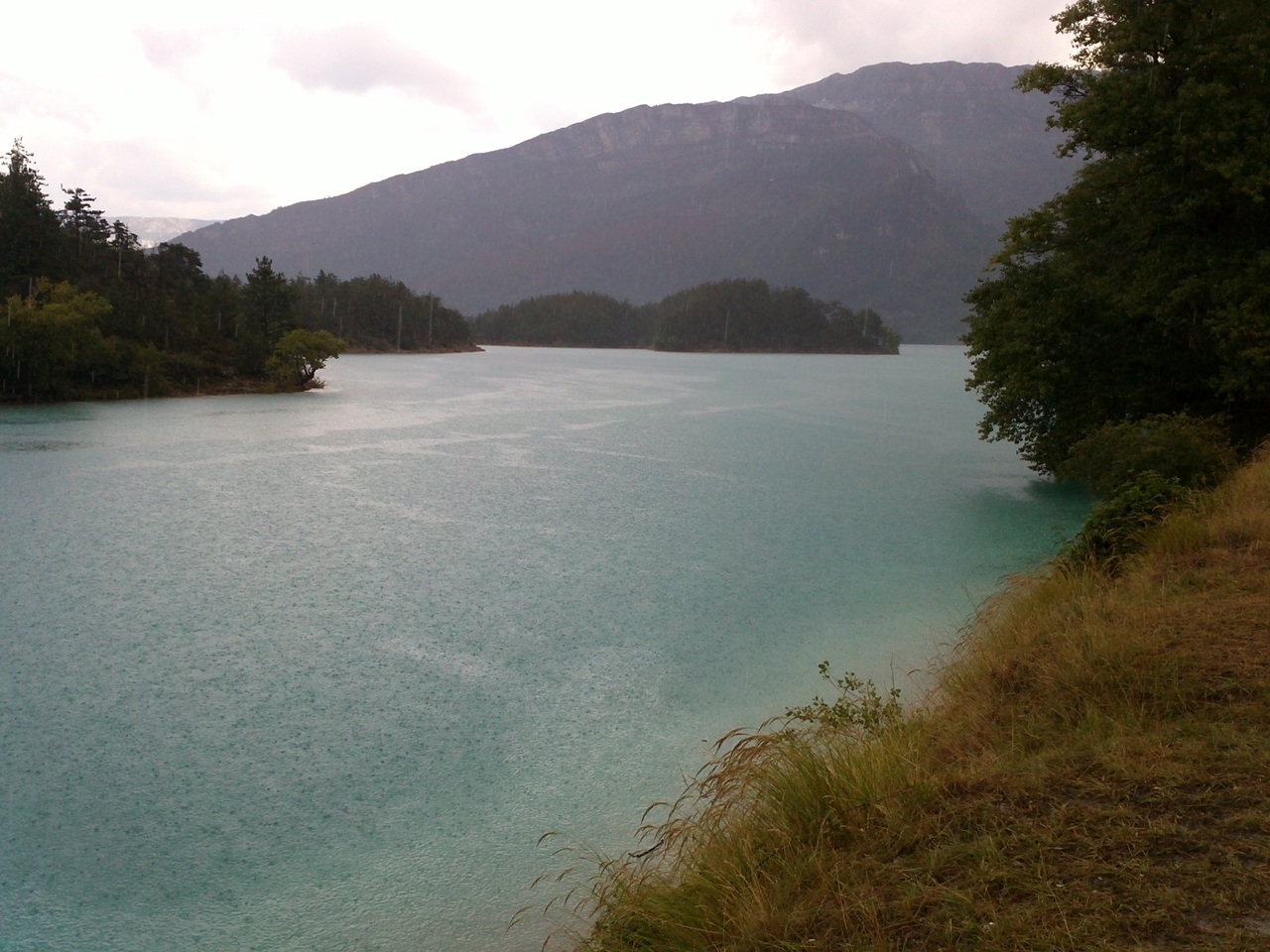 Озеро в самом деле имело весьма чудный оттенок воды, но, пока мы искали место для красивой фотографии, из-за угла подлетела туча и заслонила солнце. Потом начал накрапывать дождик. Сильнее и еще сильнее. В итоге мы спрятались под большим деревом и ждали минут 20, пока дождь успокоится.