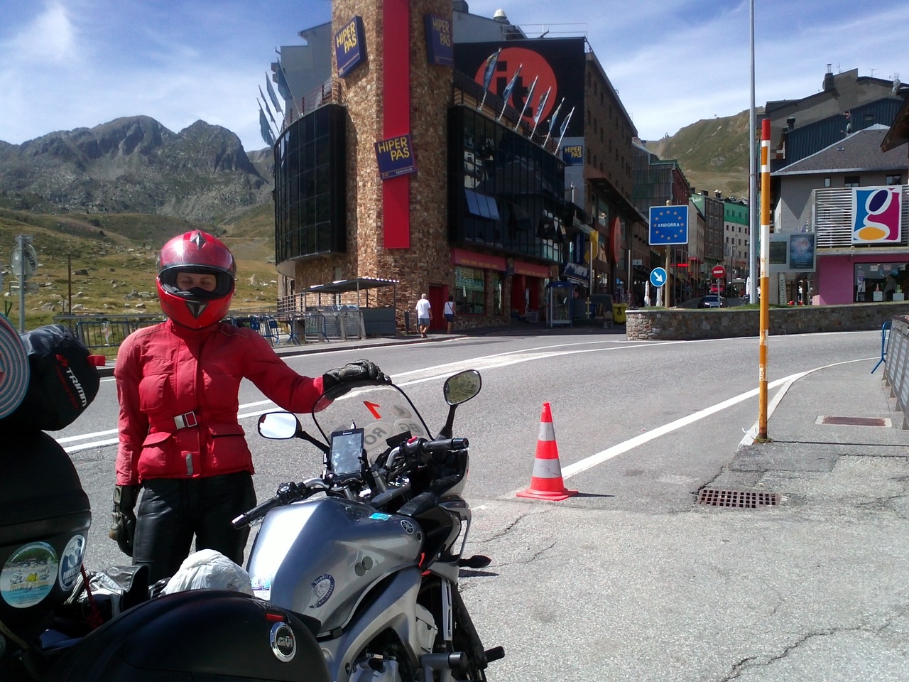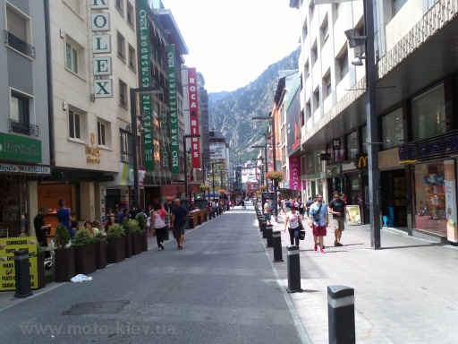 Фактическая граница Андорры - довольно веселое место. Представьте себе обычную горную дорогу, травка зеленеет, кругом горы, всё такое. Вся эта идиллия резко прерывается на табличке "Андорра". Сразу за ней начинаются десятки магазинов, Макдональдсов, заправок, толпы людей вокруг! После французской глуши мы разом попали в городскую суету. Разгадка такой привлекательности Андорры для туристов очень проста - в Андорре нет пошлин почти на всё. Алкоголь, шмотки, бензин, горнолыжное снаряжение и даже мотоэкип (вот этот момент мы прозевали, если бы знали, то заехали бы в мотомагазины) по ценам гораздо меньшим, чем в соседних Франции и Испании. Бензин стоил там 1,16 против 1,4 во Франции и 1,25 в Испании. Заправок было очень много, ведь каждый, кто проезжал мимо, обязательно заправлял полный бак!