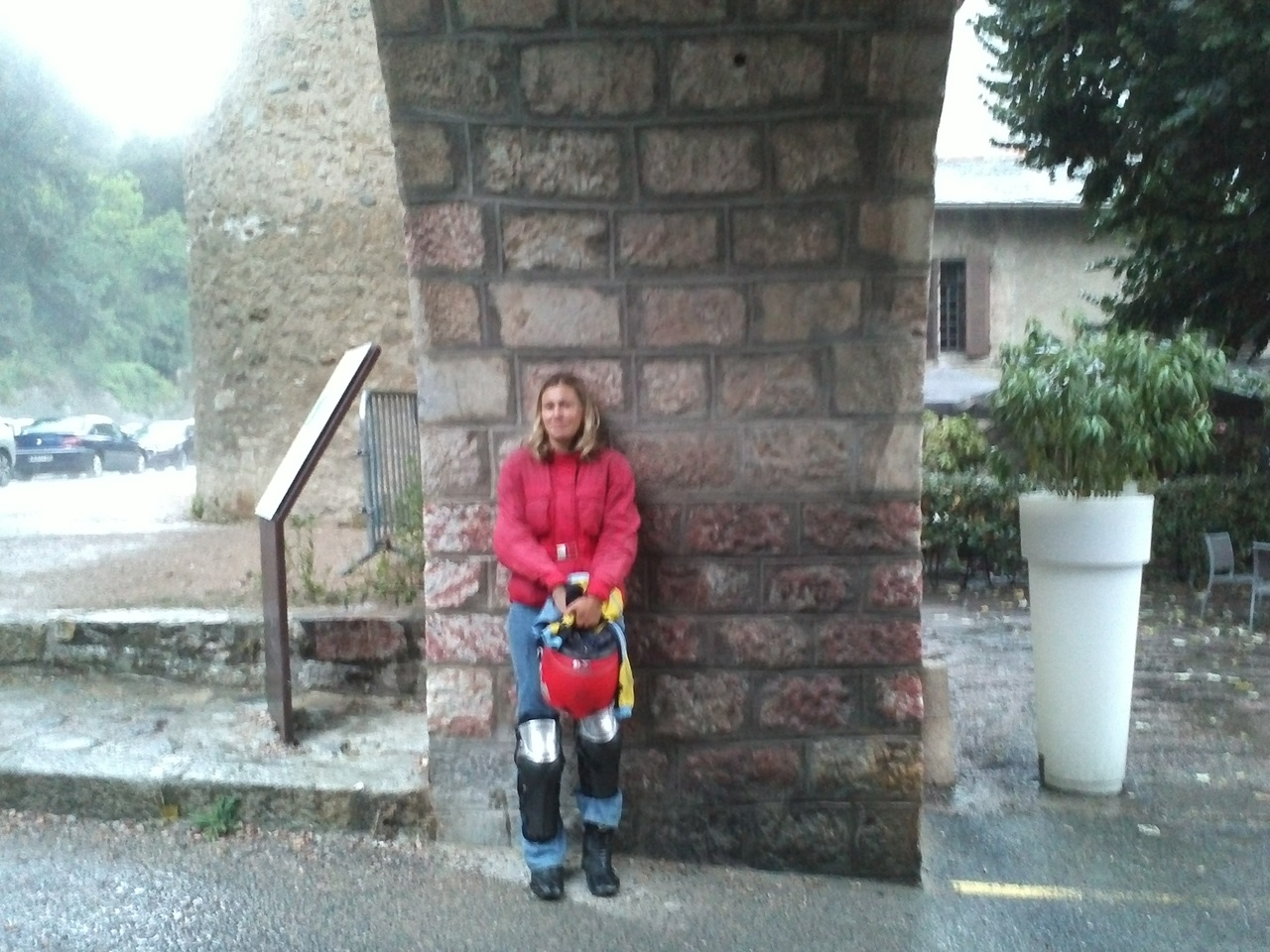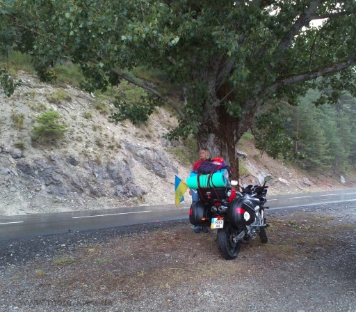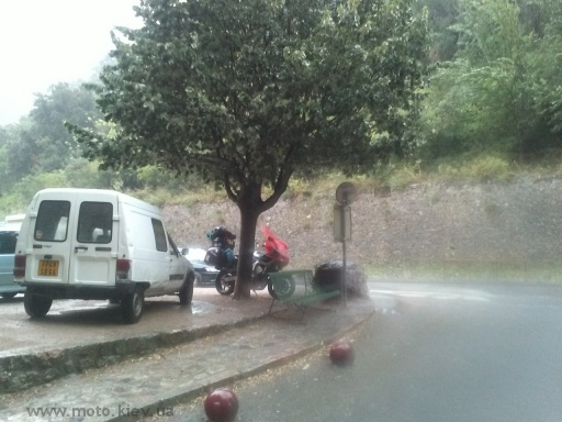Радовались мы недолго, впереди небо заволокло огромной черной тучей и начал накрапать дождик, стало холодно. Мы напялили дождевики. Помокнув минут 20 под дождем, наконец-то выехали из Альп на относительную равнину, где стояла дикая жара. Сняли дождевики.