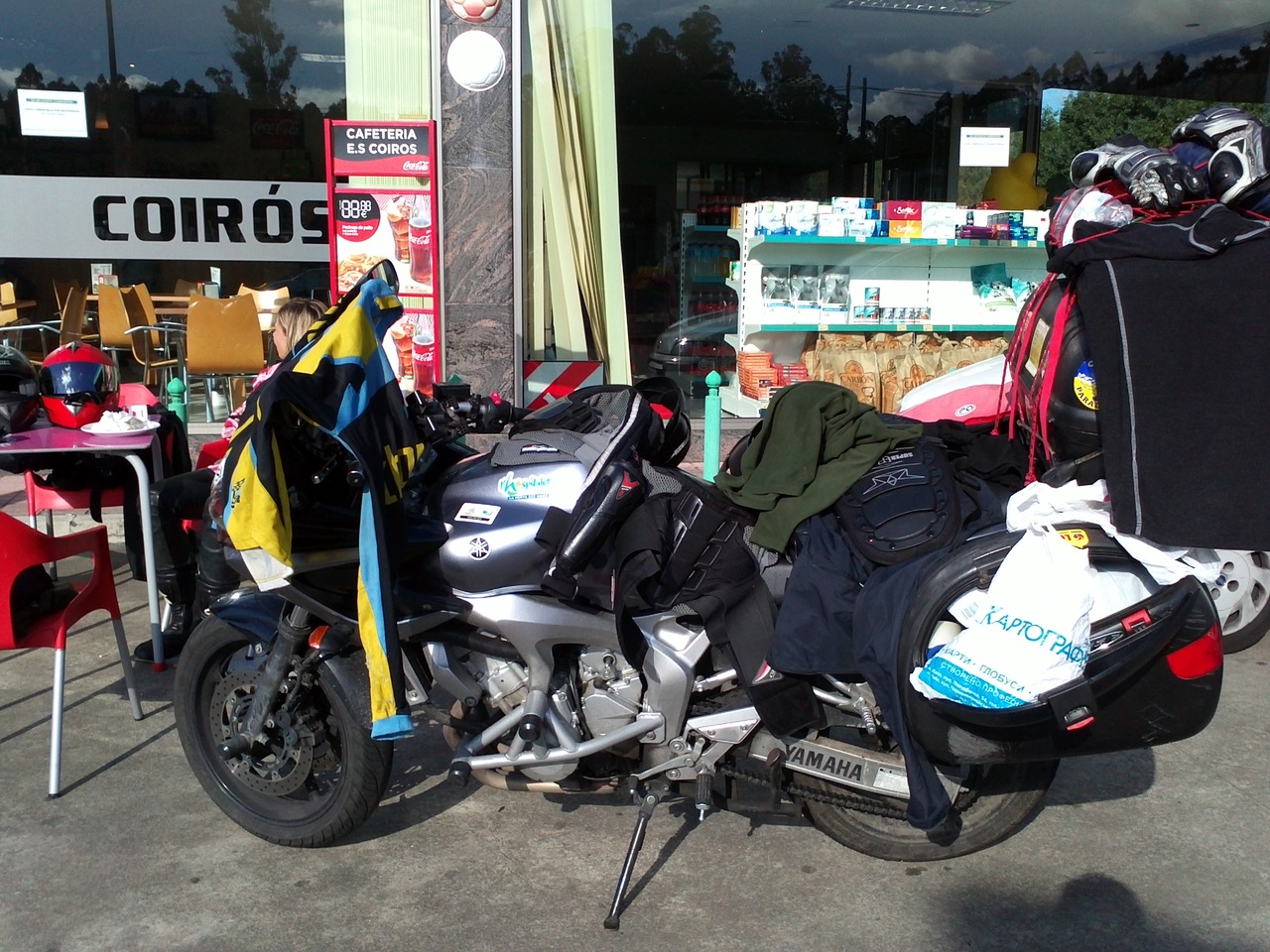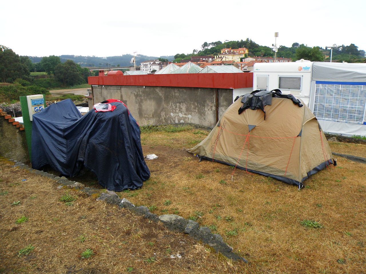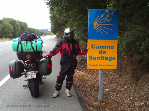 Мы покушали, вытащили шмотки из палатки, сложили палатку, и в этот момент начал моросить мелкий дождь. ААА! Именно в тот момент, когда палатка уже сложена, а шмотки не сложены от слова совсем. Уложить все в кофры - процедура, требующая терпения и времени. В итоге мы заметались как ужаленные, с каждой минутой наши вещи промокали все больше. Добрая тетя из соседнего кемпера предложила нам укрыться у неё, но нам надо было ехать! Дождик нарастал с каждой минутой. Тётя выдала нам зонтик, которым мы укрыли часть вещей. В спешке собрались, напялили влажные шмотки, дождевики и поехали дальше. Было холодно, не более +15. Мы решили ехать в сторону Сантьяго, хоть одним глазком глянуть на европейскую Мекку.