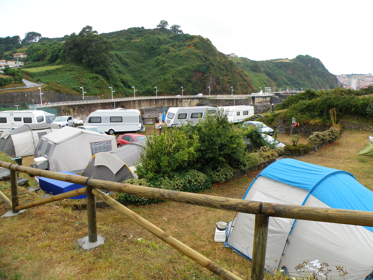 Расположились мы в кемпинге на берегу океана, неподалеку от Хихона. Один из тех кемпингов, где полно народу по малопонятным нам причинам. Вокруг были красивые скалы, но нормальных пляжей мы не заметили. Ветер немилосердно трепал нашу палатку, не давая толком поспать, а после полуночи начался сильный дождь, который лил почти до утра. Ливень создавал очень большие децибелы в нашей палатке, так что спали мы условно.