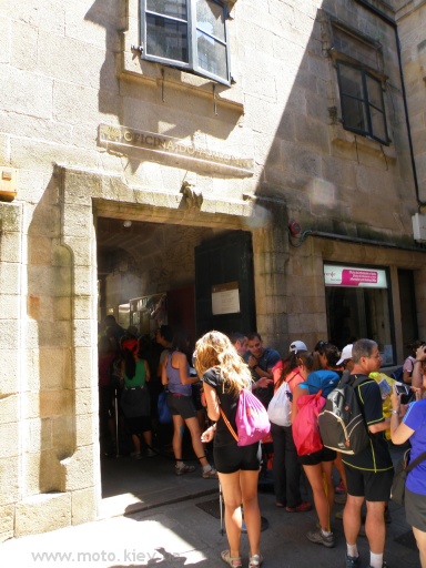 Очередь паломников за какой-то официальной бумажкой, что они в самом деле прошли Камино.