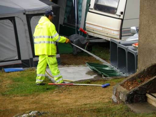 Утром я проснулся с мыслью, что сегодня 31 июля - годовщина нашей свадьбы, мы встречаем её в весьма любопытном месте! Мы вяло начали собираться, вместе с тем благодарили небеса, что дождь все-таки закончился. Пока собирались, увидели занятную картину, как работник кемпинга моет мусорники, да еще с каким-то чистящим средством, снова почувствовали себя дикарями.